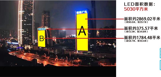媒體規格:合計5030平方米(A樓外立面約2869.02㎡, B樓外立面約1784.48㎡,B樓內透屏約375.57㎡)