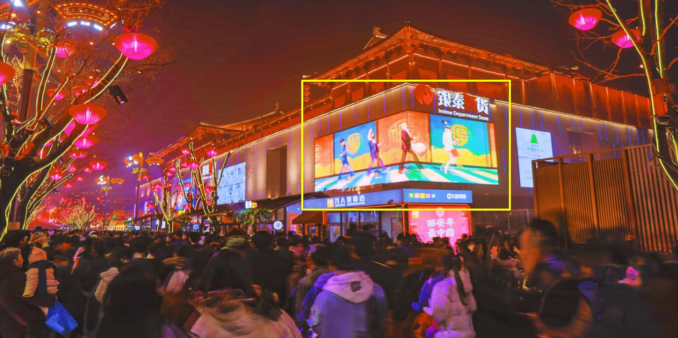 媒體詳情: 該媒體位于西安曲江大雁塔以南雁塔南路也叫大唐不夜城現代唐人街,是西安市曲江CCBD及QCIC核心板塊,商務部提名全國11條步行街之一,地鐵三號線大雁塔及大唐芙蓉園兩站在這里匯集。獨特的設計大屏面向盛唐天街主路及銀泰A、B館之間區域,視覺投放高達270°,是春晚的主會場也是萬眾矚目的焦點。三屏聯動超大視野輻射范圍,引領時尚潮流的地理位置和最高技術的應用,創造超強的傳播效果,超震撼的視覺沖擊,為客戶提供超值服務。