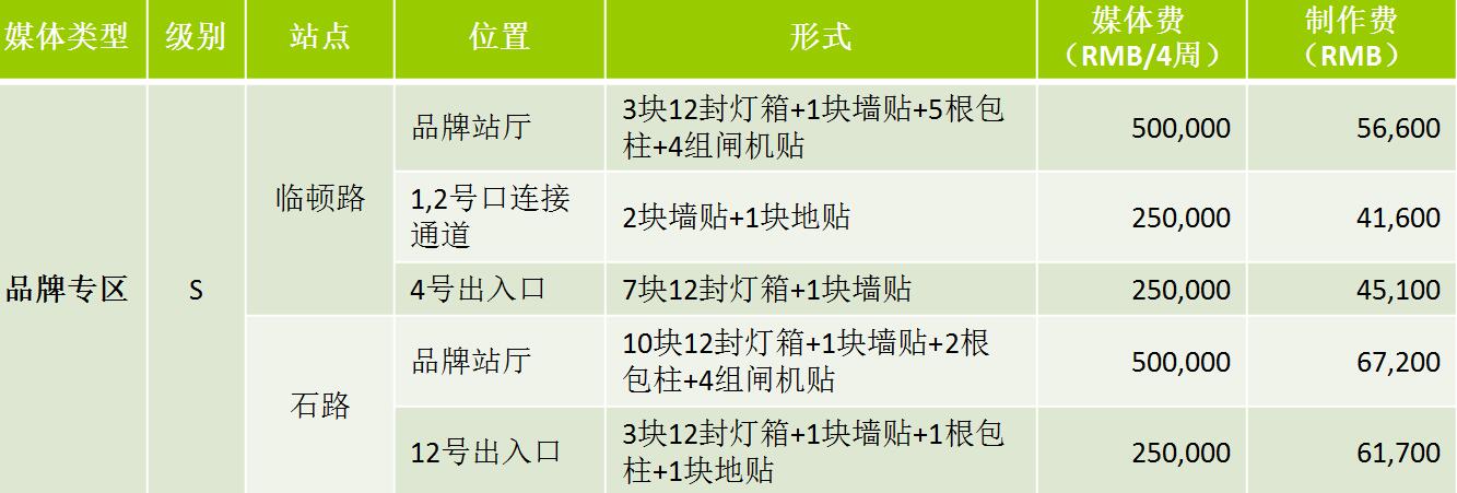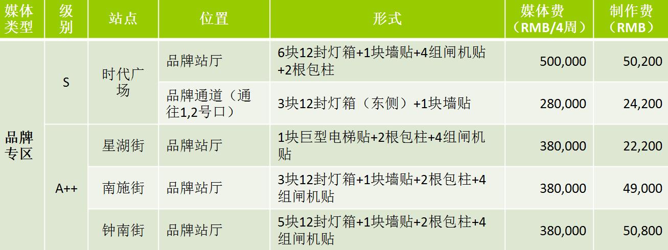 1、2號線全線站點/400塊/6聯裝:媒體費(RMB/4周)280,000