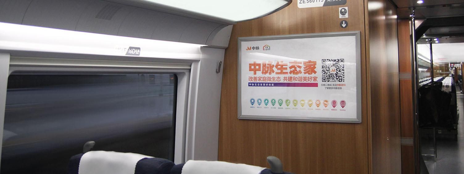位于所有高鐵車廂內(nèi)行李架下方,對(duì)稱發(fā)布,氣勢(shì)磅礴,視覺沖擊力強(qiáng),無論坐、立、行,都能有絕佳的視覺效果,利于品牌整體性展示。