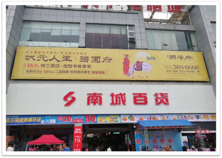 戶外大型廣告牌位于桂林核心商圈——甲天下商圈最繁華的南城百貨超市入口處,每天人流量約8萬,車流量約5萬,是目前桂林市最核心的商圈之一。