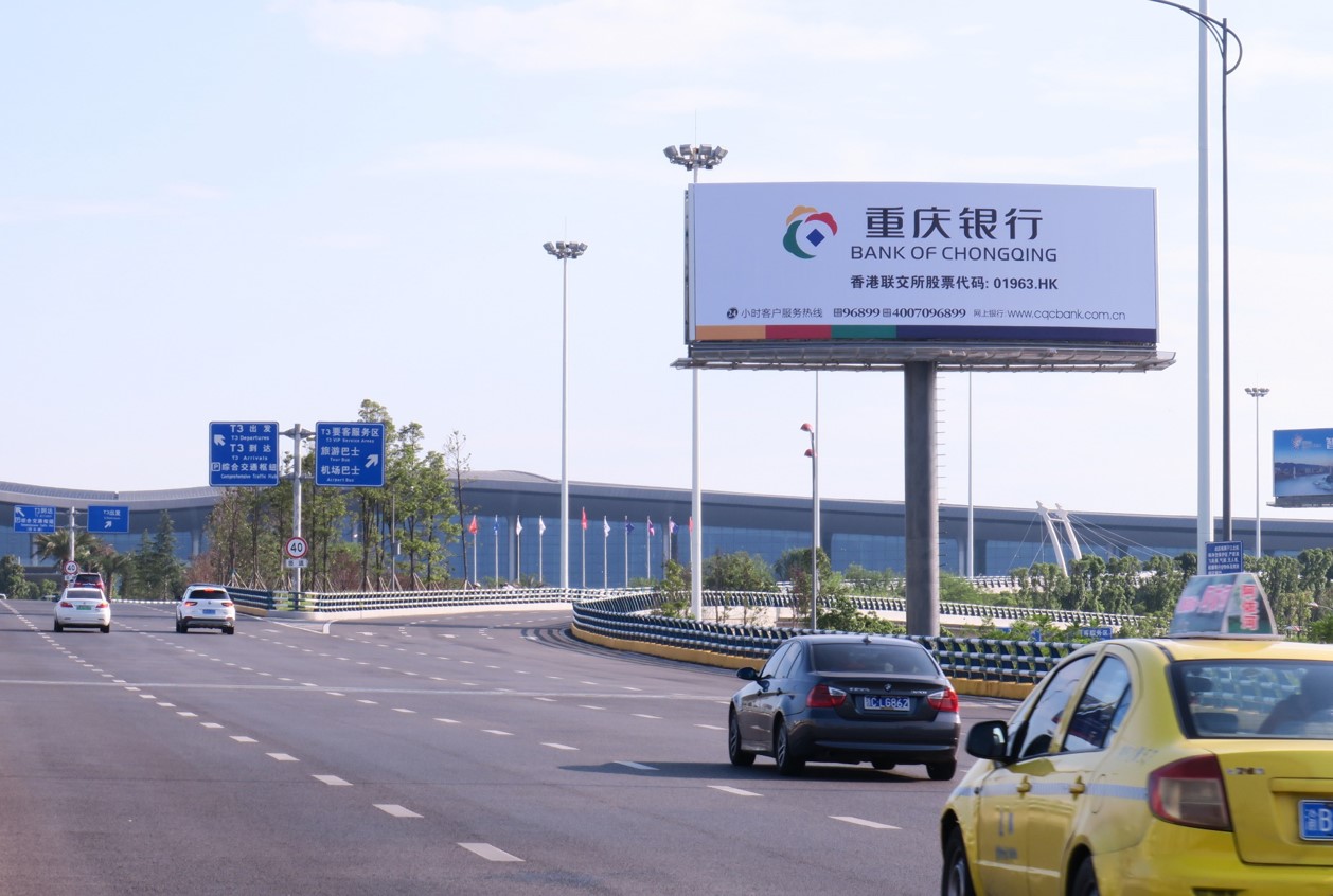 T3航站樓進(jìn)場(chǎng)路第一塊高立柱,地標(biāo)性媒體 ?主城、渝鄰高速、第一機(jī)場(chǎng)大道三條通道匯集。