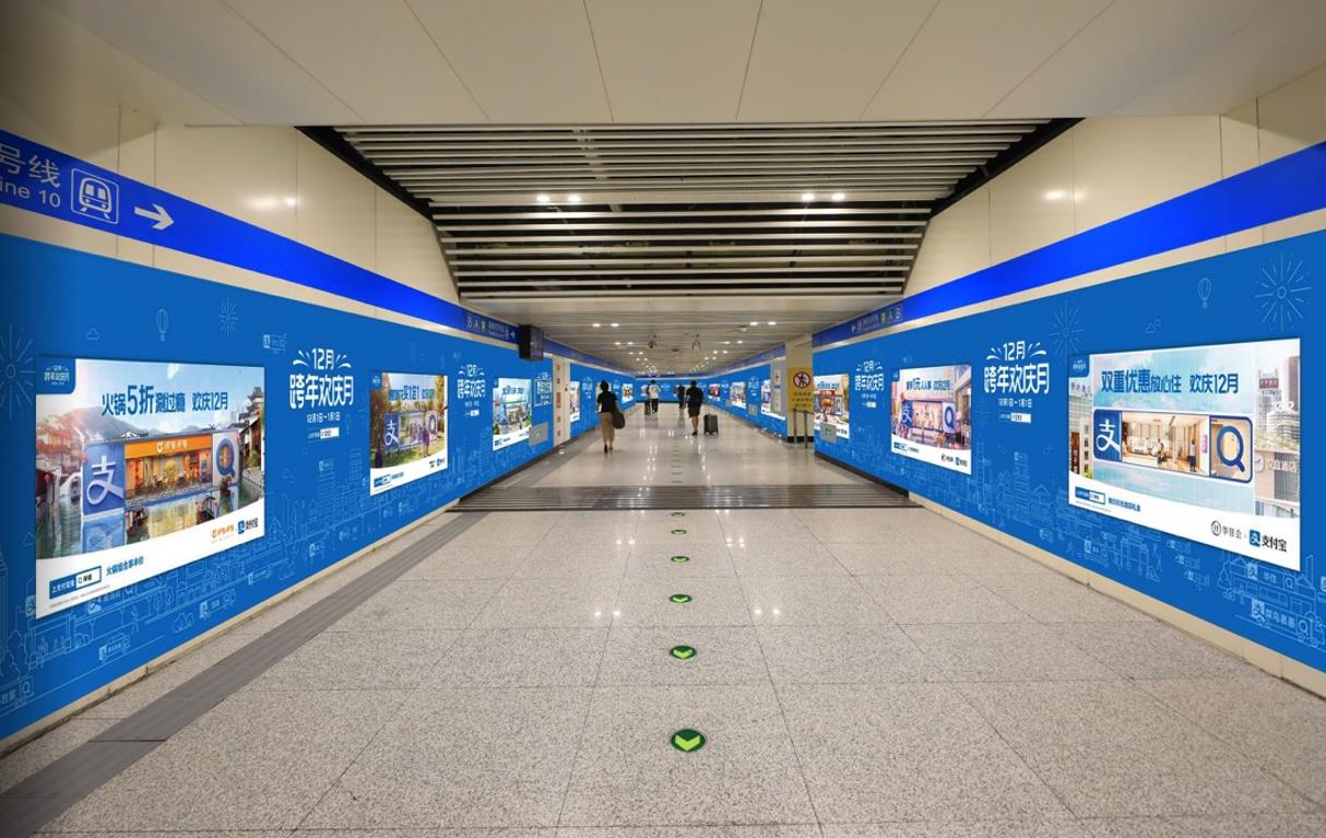 通道內(nèi)墻面呈弧形 ,雙側(cè)墻貼超大面積覆蓋,廣告的空間沉浸感強(qiáng)+可直面換乘通道內(nèi)的巨大客流,品牌推廣效果顯著
