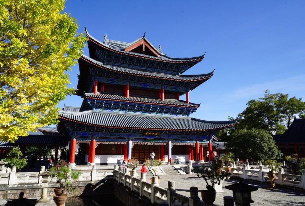 木府景區(qū)占地46畝,中軸線長369米,整個(gè)建筑群體座西朝東,“迎旭日而得木氣”。木牌坊上大書“天雨流芳”四字,乃納西語“讀書去”的諧音,體現(xiàn)了納西人推崇知識(shí) 的靈心惠性。