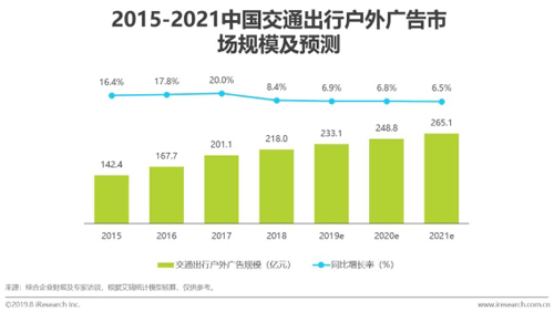 根據艾瑞咨詢數據顯示,2018年中國交通出行場景戶外廣告市場規模達218億元,同比增長率為8.4%。艾瑞分析認為,未來交通出行中戶外廣告的發展穩定。一方面是因為交通場所建設和人流量都有著穩定的規劃和控制,且交通場所的商業化滲透率也較為飽和,因此從供給和需求上都不會產生大的變化;另一方面,由于交通場所的公共安全屬性,難以出現通過增加單位場所內的廣告資源類型或數量來實現新的增長。