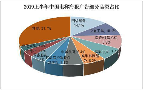 從電梯海報廣告細分品類占比情況來看,其中2019年上半年中國電梯海報廣告細分品類中占比最大的仍為網絡服務,與電梯電視廣告相同,而第二、三名則分別為交通工具、醫療/保薦機構,占比10.1%、8.9%,移動客戶端應用軟件及服務占比5.1%,排到第七位。