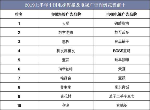 2019年上半年中國電梯海報廣告刊例花費放緩,但食品、飲料等行業的花費增長顯著,其中電梯海報廣告排名前五大的品牌分別為天貓、蘇寧易購、惠氏、科發源植發和寶沃。電梯電視廣告媒體高度依賴頭部品牌,其中2019年上半年排名前五大的品牌分別為鉑爵旅拍、妙可藍多、良品鋪子、BOSS直聘和瑞幸咖啡。