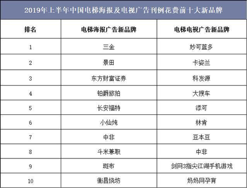 隨著傳統品牌廣告主對電梯廣告媒體的認可度逐漸提升,電梯電視/電梯海報新品牌數量大幅增長,2019年上半年中國電梯海報廣告刊例花費前五大新品牌分別為三金、景田、東方財富證券、鉑爵旅拍和長安福特,電梯電視廣告刊例花費前五大新品牌分別為妙可藍多、卡姿蘭、科發源、大搜車和添可。