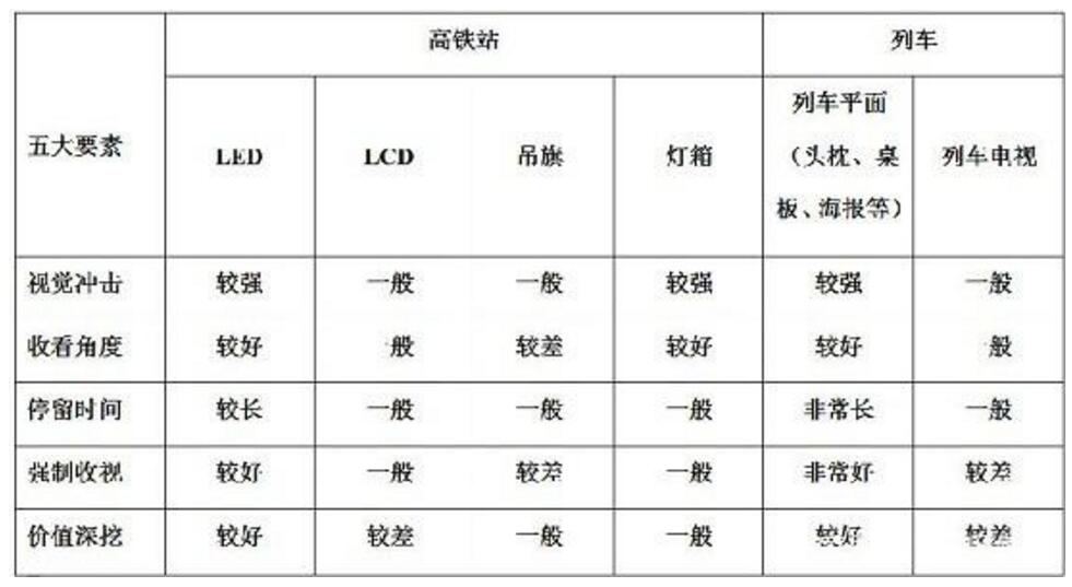 高鐵廣告媒體傳播的節(jié)點特性明顯,為社會化價值觀傳播提供了契機。回家、探親、學流、旅游等出行節(jié)點為企業(yè)在階段行品牌傳播上創(chuàng)造了社會化價值傳播內容。高鐵站內媒介優(yōu)劣勢分析高鐵LCD媒體:媒體位置較散,畫面小,品質低,關注度較低;高鐵吊旗媒體:媒體位置過高,超出正常的視覺范圍,光線暗,導致到達率較低;列車電視媒體:媒體點位少,覆蓋范圍有限;廣告時段一小時一次,品牌曝光率低;列車雜志媒體:受旅客自主取閱影響,5個座位一份,廣告到達率低;翻閱時存在廣告抵觸心理,會直接翻過,接觸率低;漏放丟失嚴重,監(jiān)測困難;高鐵LED媒體:與車次信息結合,強制觀看,廣告到達率高;站內唯一權威發(fā)布平臺,具備公信力;媒體位置較好,畫面大,視覺震撼強,關注度高。列車平面媒體:媒體資源豐富,可根據(jù)車型、線路劃分各級消費人群;位置醒目,可視效果好,沖擊力強;面對面,一對一近距離吸引,到達率高;高鐵燈箱廣告:媒體位置較多,形成點攔截;部分媒體位置醒目,干擾媒體少,到達率高;