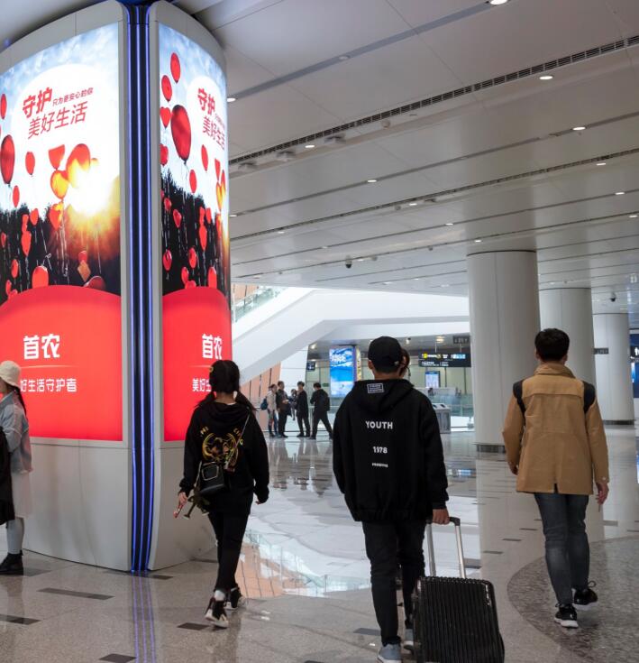 媒體分析: 軌道交通必經區 100%覆蓋乘坐地鐵和高鐵往來機場的人群。面向地下一層值機區,雙面呈現聯排布局,在人群前往值機、值機后前往安檢的路徑上形成必經必視、多次曝光的傳播效果。