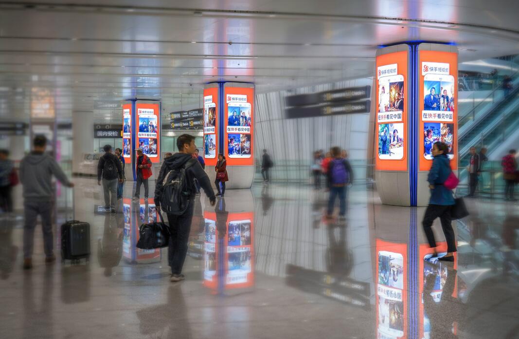 媒體分析: 中央樞紐區 位于三層國內值機大廳中央樞紐區域,四面品牌柱對稱式發布,100%覆蓋三層以及四層值機的國內出發旅客。