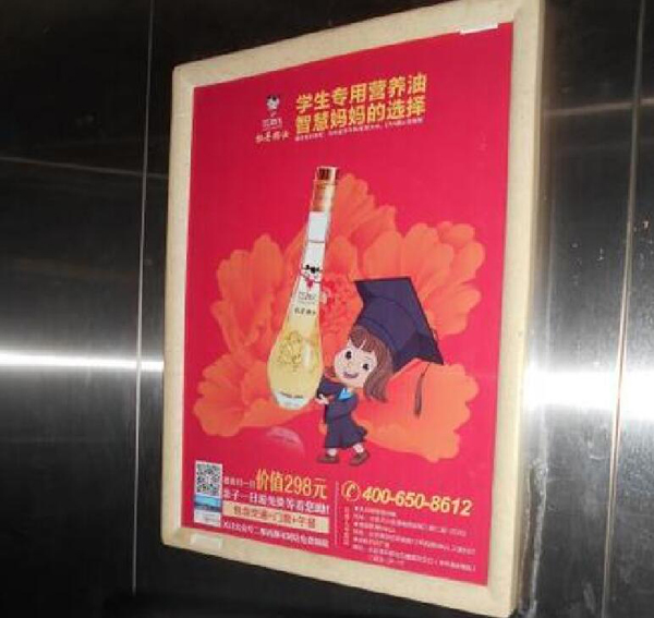 電梯框架廣告,也就是我們常說的電梯海報廣告,是一種靜態畫面廣告形式。廣告位置在電梯轎廂內側或電梯等候廳墻壁上,畫面尺寸為420*570mm,投放成本比較少,同時又是所有居住人群的必經之地,所以電梯框架是電梯廣告中投放最多的廣告形式。