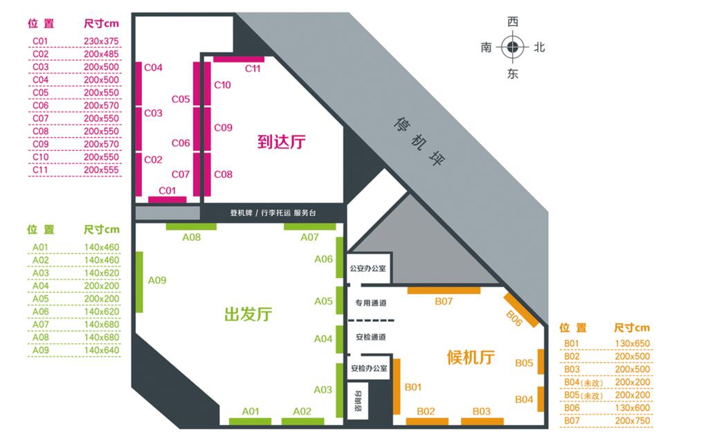 目前,現有機場候機樓分為三個廳,出發廳、候機廳和到達廳共計27個廣告位,燈箱采用LED高光漫反射光源及專業的燈箱布,色彩還原度極好,每個廣告位只做獨立宣傳,保證收視唯一性。