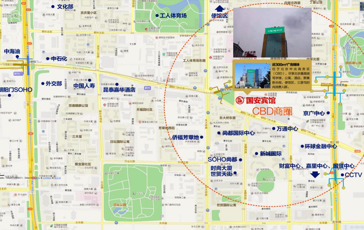 媒體效果、介紹:CBD國安大廈位于朝陽門外大街的黃金地段--朝陽門外大街關(guān)東店北街1號、中信國安大廈樓頂,直面工體東路、東大橋路、朝陽路、朝陽門外大街及朝陽北路交匯的五岔路口,地理位置優(yōu)越。