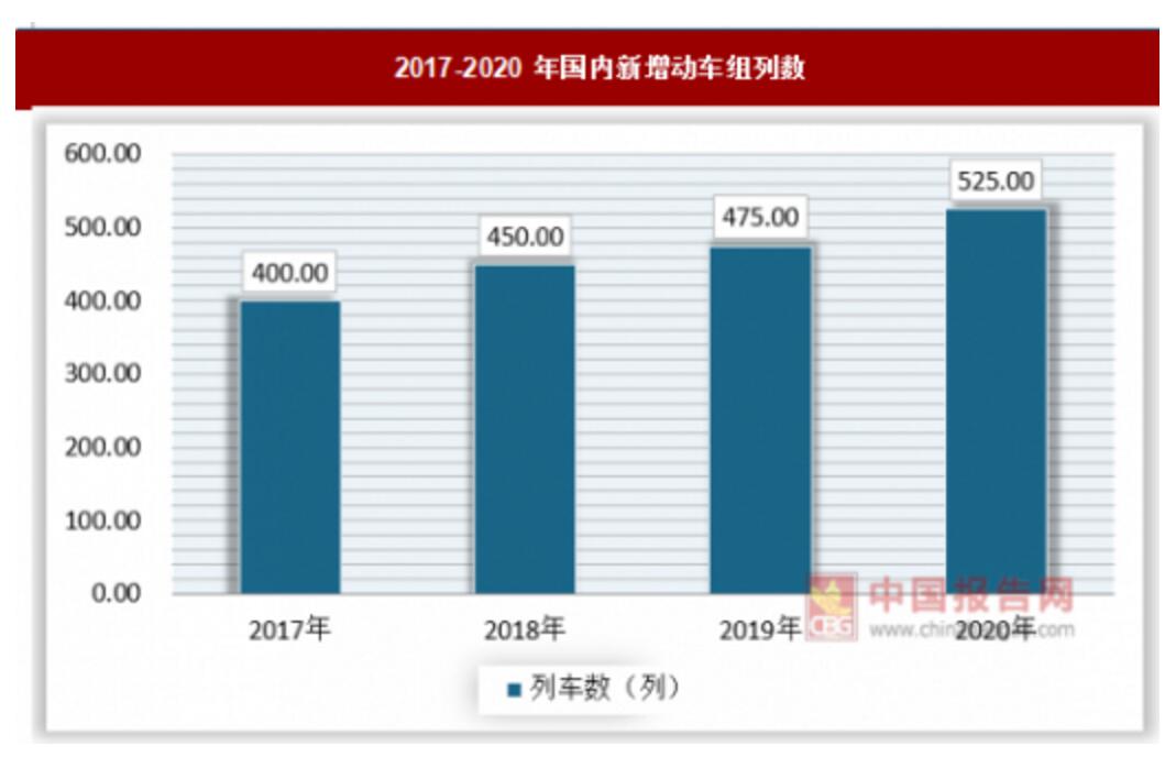 到2020年我國高鐵運營里程將達到30000公里左右,根據歷年高鐵通車情況的分析,預計“十三五”后三年(2018—2020年),我國新增動車列數為1450列左右(450/475/525),招標金額在2500億左右(2018年—2020年)。即2017年-2020年國內新增動車組列數分別為400列、450列、475列、525列(8輛編組)。