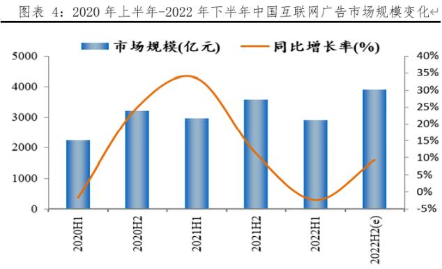 8月2日QuestMobile發布《2022互聯網廣告市場半年大報告》顯示(圖表4),2020年上半年-2022年下半年中國互聯網廣告市場規模波動變化明顯,今年上半年中國互聯網廣告市場規模為2903.6億元,同比降低2.3%。一般下半年廣告規模呈良好態勢,整體來看2022年下半年互聯網廣告市場規模略有增加,同比增長9.4%?!?br />