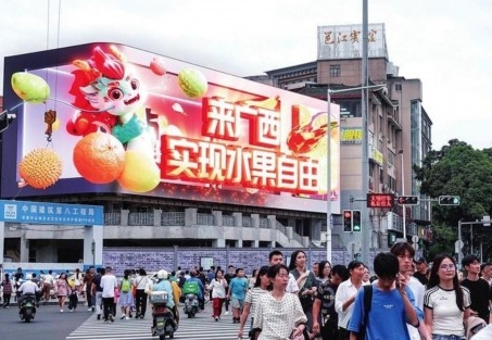 “來廣西實(shí)現(xiàn)水果自由”的宣傳片出現(xiàn)在中山路裸眼3D廣告大屏上,鮮活生動(dòng)。