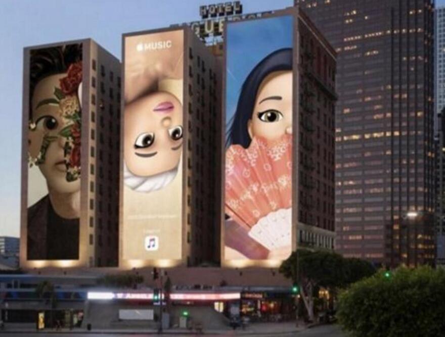 在洛杉磯著名的菲格羅亞酒店前,一套由Memoji版歌星宣傳畫組成的巨幕三聯(lián)畫布滿三棟建筑的外墻,不遠(yuǎn)處就是格萊美頒獎(jiǎng)典禮的主會(huì)場斯臺(tái)普斯中心。三聯(lián)畫分別是由Memoji自定義表情組成的Ariana Grande、Kacey Musgraves和Shawn Mendes,頗為引人注目。